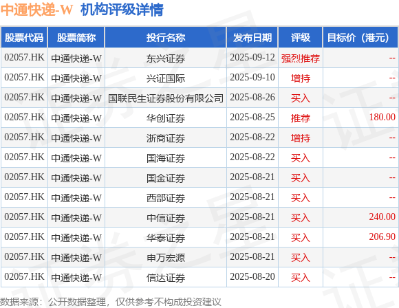 投行对该股的评级以买入为主,近90天内共有8家投行给出买入评级,近90天的目标均价为208.97港元。东兴证券最新一份研报给予中通快递-W强烈推荐评级。