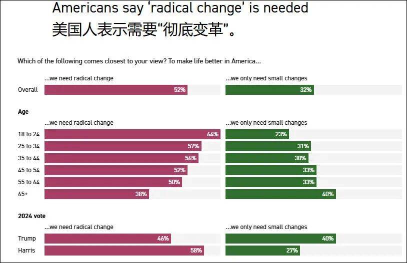 民众的普遍不满引发了对国家全面改革的诉求:略占多数(52%)的人认为,要改善美国的生活,“彻底变革”是必要的。
