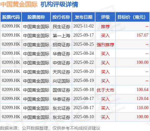 截至2025年11月3日收盘,中国黄金国际(02099.HK)报收于128.4港元,下跌2.28%,成交量242.55万股,成交额3.07亿港元。投行对该股的评级以买入为主,近90天内共有8家投行给出买入评级,近90天的目标均价为116.29港元。民生证券最新一份研报给予中国黄金国际推荐评级。