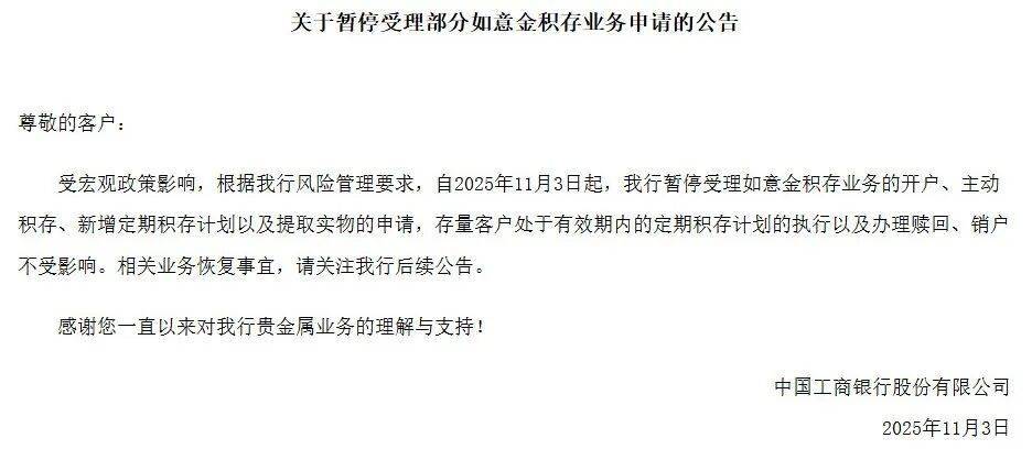 工商银行同日也发布公告称,受宏观政策影响,根据本行风险管理要求,自2025年11月3日起,暂停受理如意金积存业务的开户、主动积存、新增定期积存计划以及提取实物的申请,存量客户处于有效期内的定期积存计划的执行以及办理赎回、销户不受影响。相关业务恢复事宜,请关注后续公告。