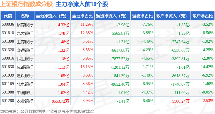 资金流向方面,上证银行(000134)指数成份股当日主力资金净流入合计18.92亿元,游资资金净流出合计11.38亿元,散户资金净流出合计7.54亿元。成份股资金流向详情见下表: