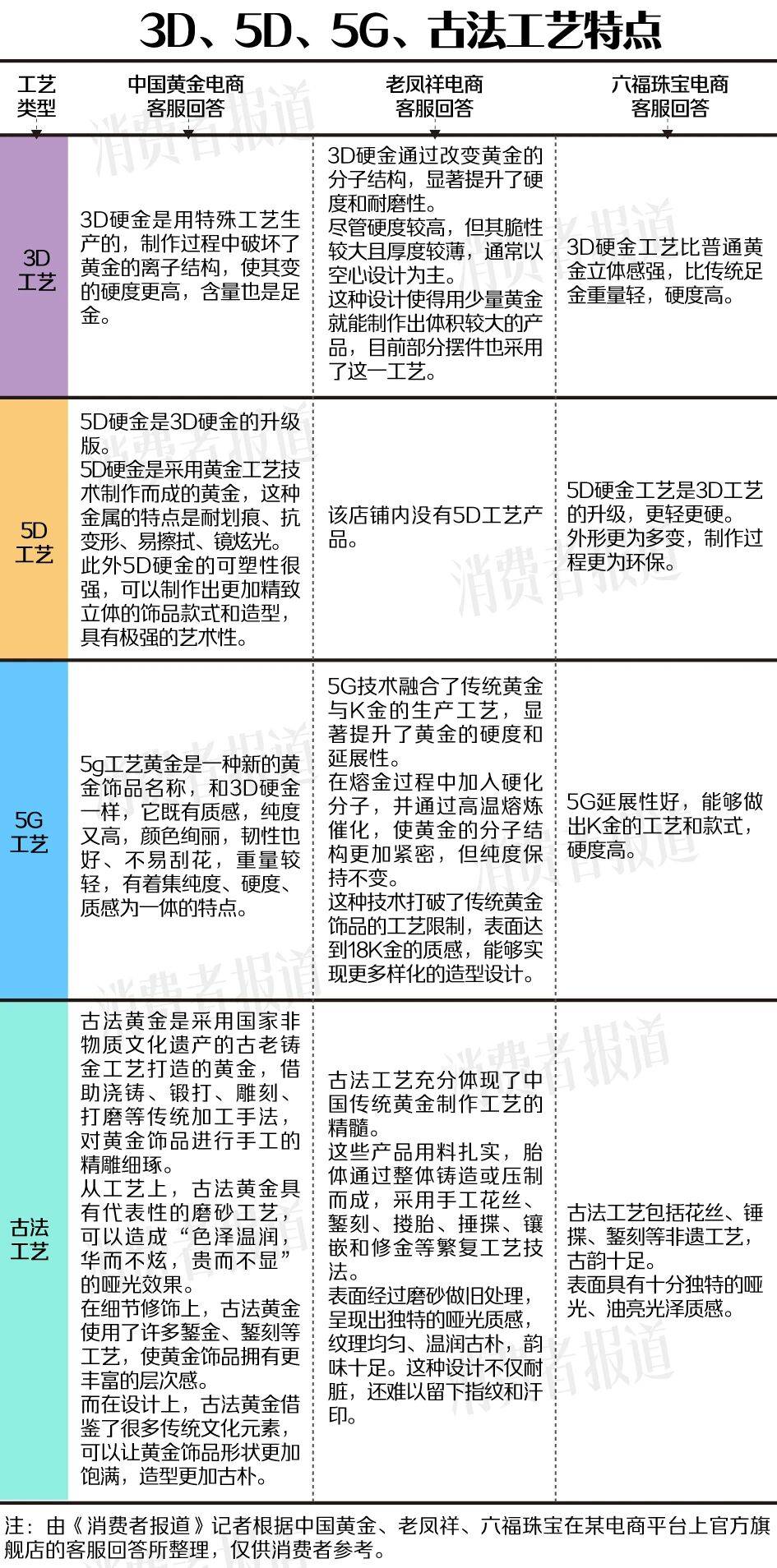 在走访黄金门店的过程中,《消费者报道》记者发现金饰具有多种工艺,较常见的是古法工艺、3D工艺、5D工艺、5G工艺等。