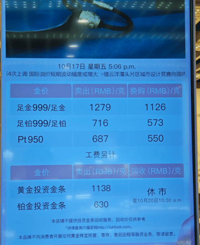 10月17日,《消费者报道》记者走访了广州地区多家线下品牌门店,发现当天多家门店的金饰价格都超过1270元/克。