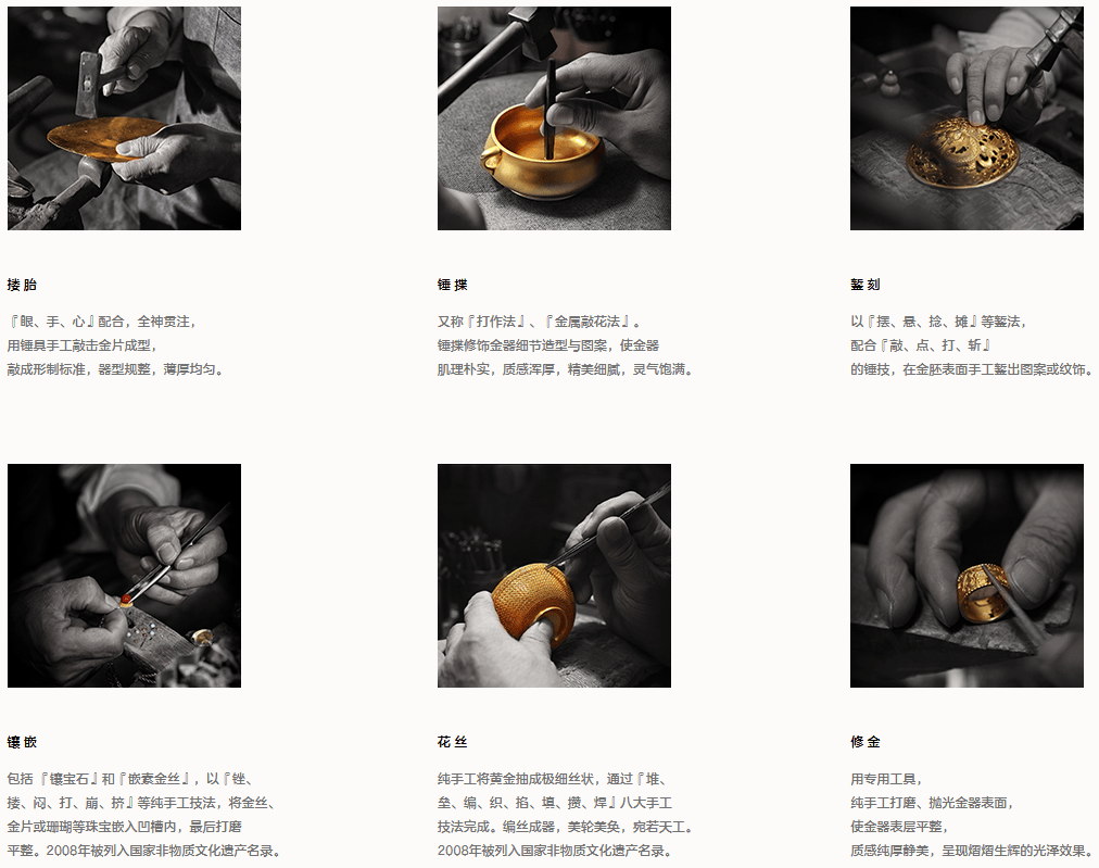 以古法工艺为例。根据2021年3月发布的团体标准T/CGA 019—2021《古法金饰品》,古法金饰品主要由两种或以上包括搂胎、刳胎、擀胎、锤揲、花丝、錾花、失蜡浇铸、金银错、宝石镶嵌、炸珠、吸珠、吹珠、手工修金、点翠、烧蓝等在内的我国传统金银细金工艺制造而成的,集现代设计理念、中华民族传统文化内涵和表面呈哑光、砂状肌理等古代宫廷金饰特征于一体的足金饰品。