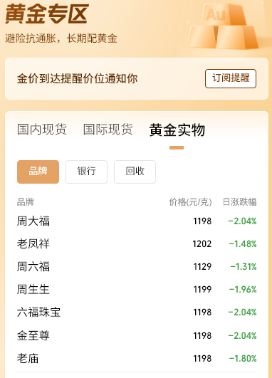 10月28日,金价调整之后,《消费者报道》再次查询发现,多个品牌的黄金实物价格依然在1200元/克左右。