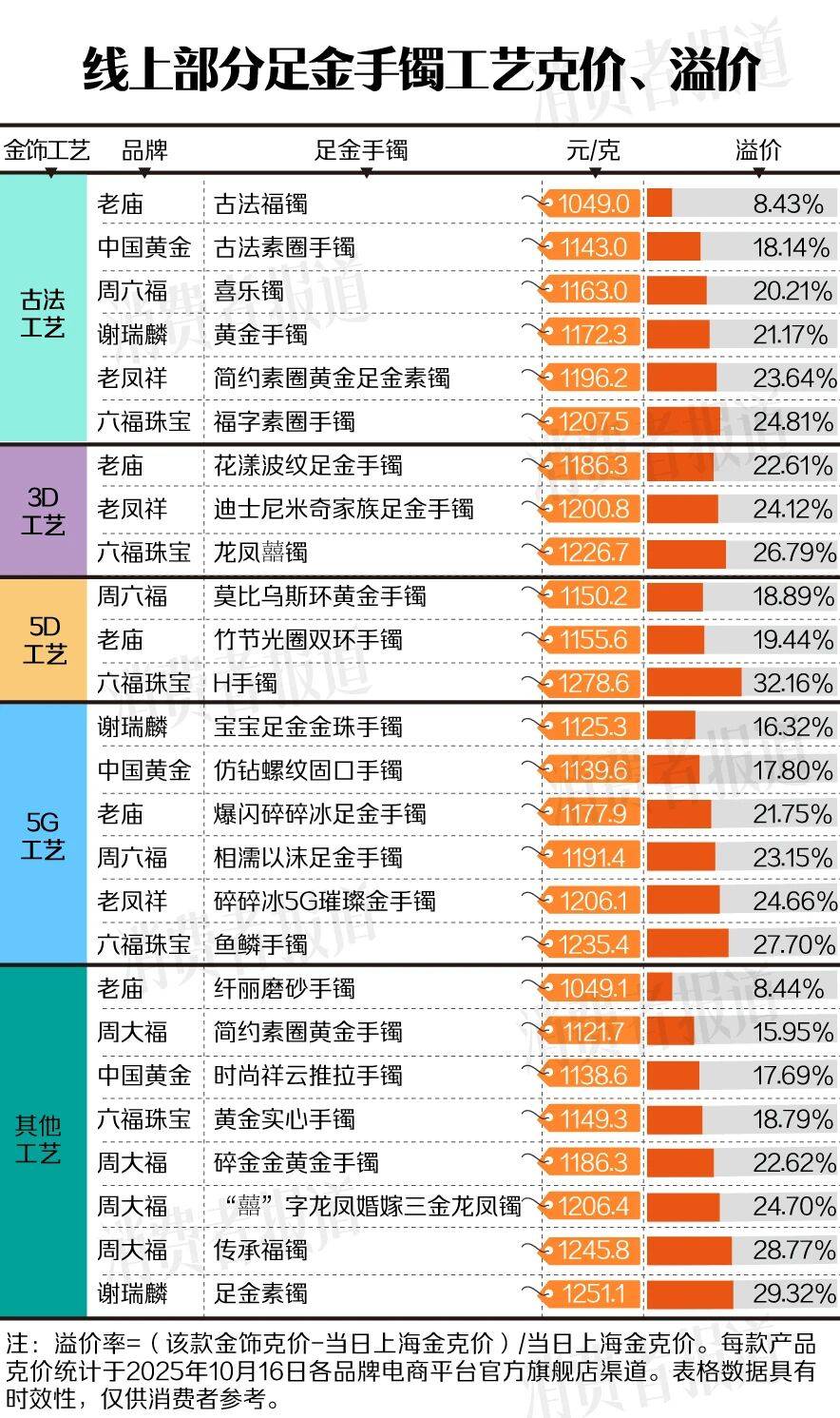 当门店金饰的克价逼近1300元,线上的金饰克价会不会更划算?3D、5D、5G、古法等不同工艺的溢价情况又是怎样的?对此,《消费者报道》记者统计了某电商平台较热销的26款足金手镯的克价及溢价情况,具体如下图: