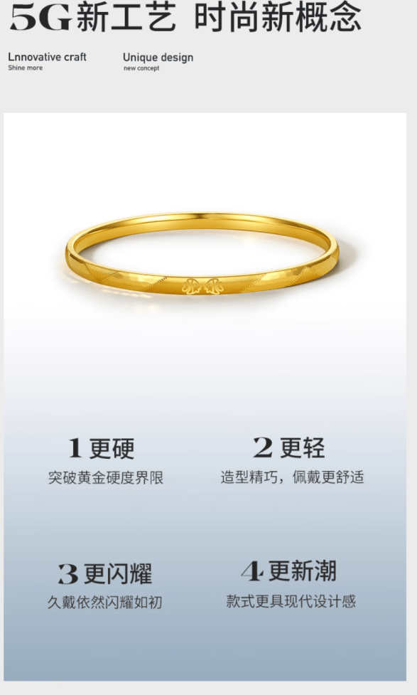 以5G工艺为例,在周大福的产品宣传页面中,具有“更硬”“更轻”“更闪耀”“更新潮”的特点。