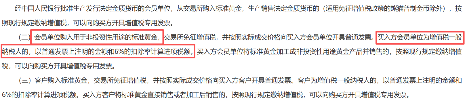 新政提到,上金交所的会员单位购入标准黄金用于非投资用途的,以普通发票上注明的金额和6%的扣除率计算进项税额。这句话很关键,让即使作为非投资用途的黄金购买成本同样因税收而上涨。