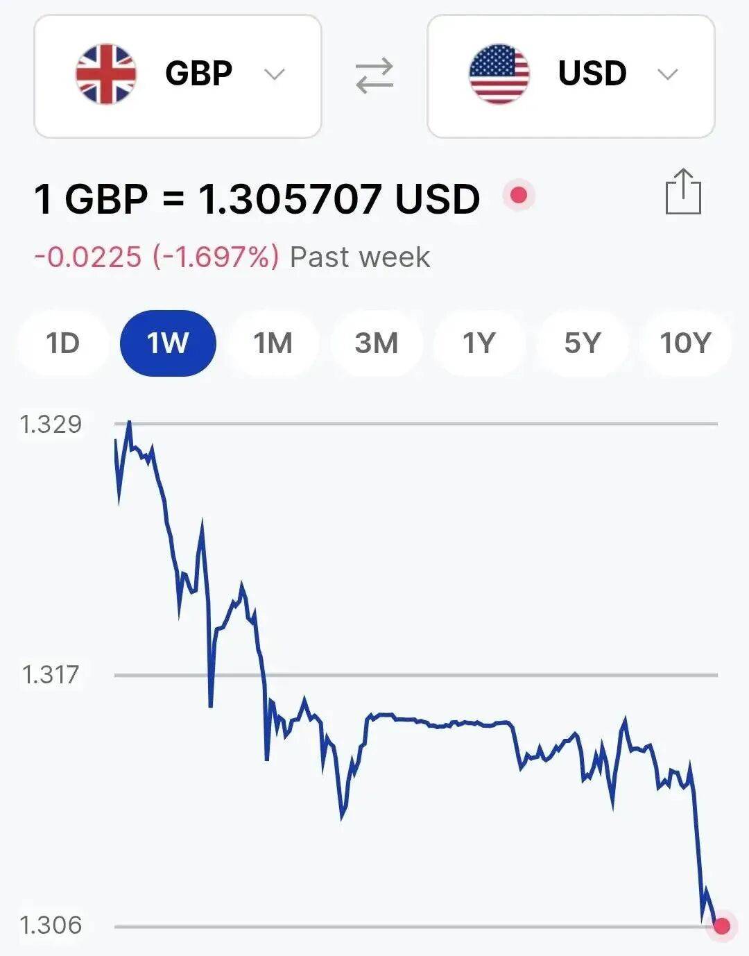 下为过去一周英镑兑美元汇率走势,从1.329继续下跌至最新的1.3057