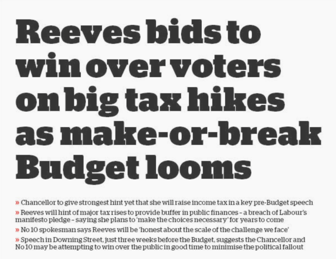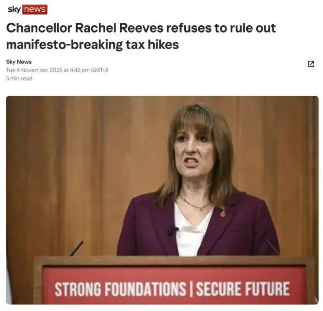 里夫斯在演讲中试图说服选民和金融市场, 她很有可能会打破此前不提高个人所得税或销售税的竞选承诺。 英媒解读称这是她迄今为止发出的最明确的暗示,意味着她在本月底(11月26日)发表秋季预算案时将提高个人所得税率。称英国财政部将提高个税税率。