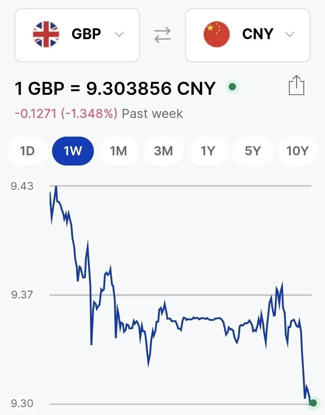 下为过去一周英镑兑人民币汇率走势,从9.43继续下跌至最新的9.30