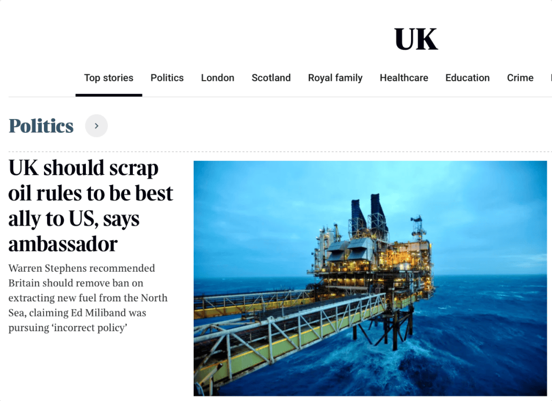 11月3日,美国驻英国大使沃伦·斯蒂芬斯(Warren Stephens)在媒体采访中批评英国工党政府的能源政策,并呼吁英国开采更多包括北海石油在内的化石燃料。
