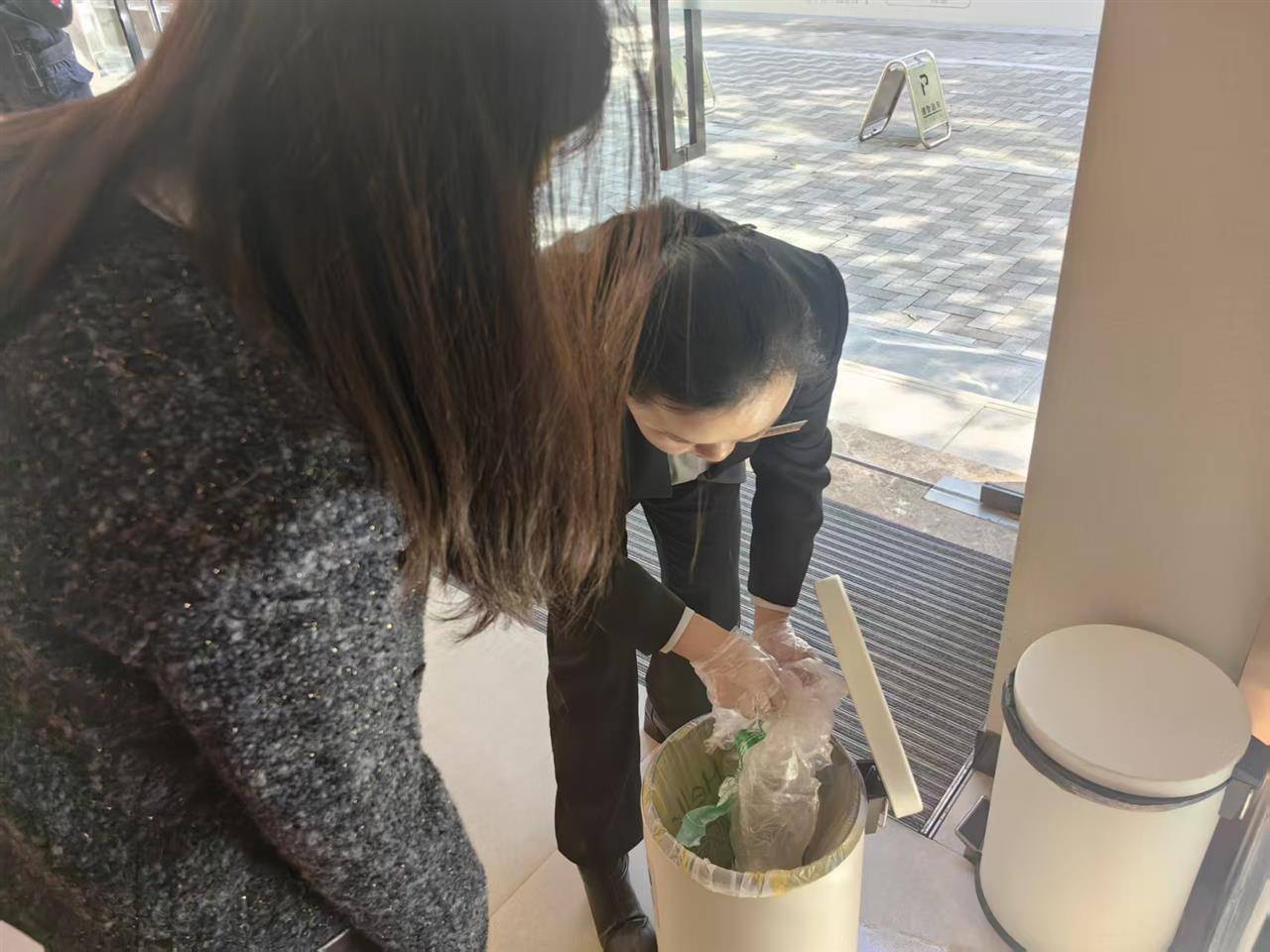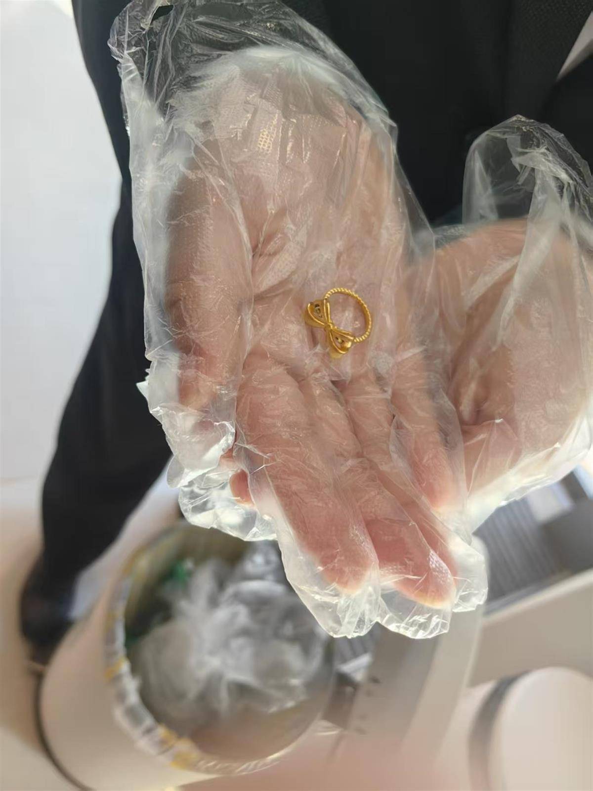 听说女子丢了金戒指,陈晨和几位同事立即行动,在大堂各个角落寻找。陈晨还戴上一次性手套翻垃圾桶,过了几分钟,果不其然看见桶底有一枚金光闪闪的东西。她小心翼翼地把金戒指拾起来交到女士手中。