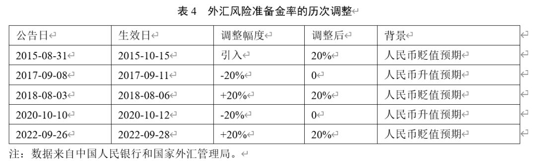 外汇风险准备金进入中国政策工具库较晚。2015年8月31日,中国人民银行决定对开展代客远期售汇业务的金融机构收取外汇风险准备金,准备金率定为20%。这是中国首次设置外汇风险准备金率。其后,中国人民银行根据宏观经济形势对外汇风险准备金率进行了4次调整(表4)。