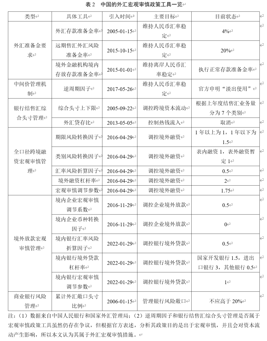在管理框架中,有关部门探索实施了一些具有非行政管理、宏观审慎性质的措施,包括外汇准备金要求、中间价管理机制、银行结售汇综合头寸管理、全口径跨境融资宏观审慎管理和境外放款宏观审慎管理等,这些措施就是中国的外汇宏观审慎措施(表2)。