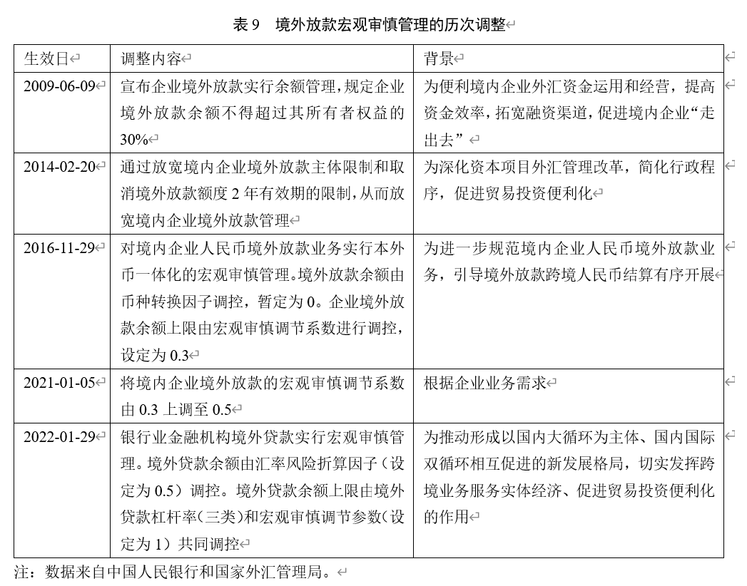 2021年1月5日,境内企业境外放款的宏观审慎调节系数由0.3上调至0.5。2022年1月29日,进一步支持和规范境内银行业金融机构开展境外贷款业务的文件颁发。文件中详细说明了境外放款宏观审慎管理的核心方法,即境内银行境外贷款余额不得超过境外贷款余额上限。监管当局根据宏观经济形势和跨境资金流动情况对境外贷款杠杆率、宏观审慎调节参数、汇率风险折算因子进行动态调整。