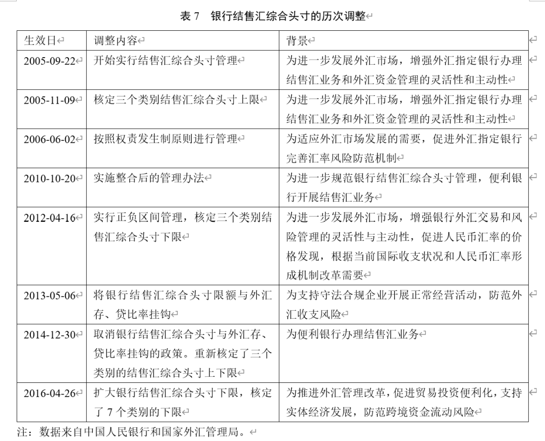 结售汇制度是中国外汇管理的重要制度安排。自1994年外汇体制改革以来,中国一直实行银行结售汇制度,对外汇指定银行实行结售汇周转头寸外汇限额管理(表7)。