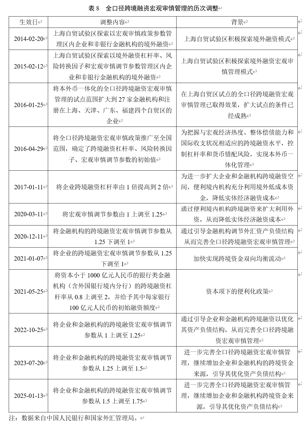 2017年1月11日开始,中国人民银行先后通过企业和金融机构的跨境融资杠杆率、宏观审慎调节参数等来宏观调节全口径跨境融资。