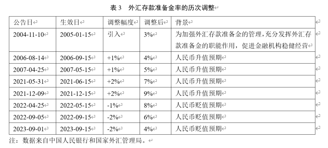 外汇存款准备金率作为存款准备金率的一种,最早是作为货币政策工具纳入中国政策工具库。外汇存款准备金率的调整能够显著影响外汇市场供求。当外汇市场供求失衡、人民币汇率波动加大、单边升值或贬值预期强烈时,调整外汇存款准备金率可以有效抑制外汇市场供求失衡,保持人民币在合理均衡水平上基本稳定。此外,外汇存款准备金率的降低还可以为市场释放流动性,降低企业偿还外债的负担。