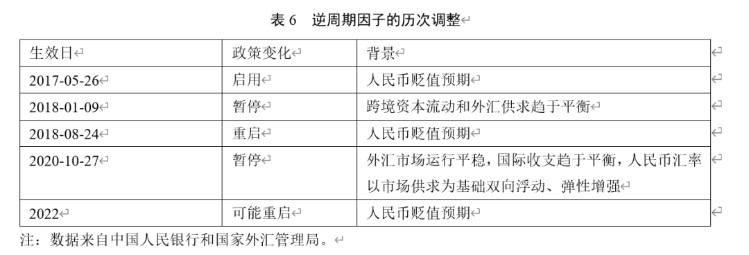 2015年“8·11”汇改以后,人民币汇率的双向波动显著增加,而外汇市场上出现的非理性行为(羊群效应)助推了人民币汇率单边贬值预期,“逆周期因子”因此产生(表6)。2017年5月26日,外汇市场自律机制秘书处宣布,基于市场化原则将人民币兑美元汇率中间价报价模型修正为“收盘价+一篮子货币汇率变化+逆周期因子”,加入“逆周期因子”的作用是适度对冲市场情绪导致的顺周期波动。