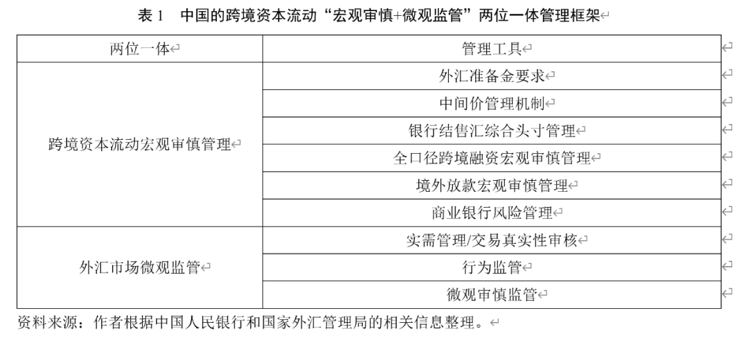 这个框架主要包括两个核心内容(表1)。一是引入以宏观审慎为核心的跨境资本流动管理工具。以市场化方式逆周期调节外汇市场顺周期波动,防范国际经济和金融风险跨市场、跨机构、跨币种、跨国境传染(孙天琦等,2021)。二是推进外汇市场微观监管方式转变。改变以微观政策逆周期调节跨境资本流动的做法,保持政策和执行标准跨周期的稳定性、一致性和可预测性,依法依规维护外汇市场秩序,强调反洗钱、反恐怖融资和反逃税。