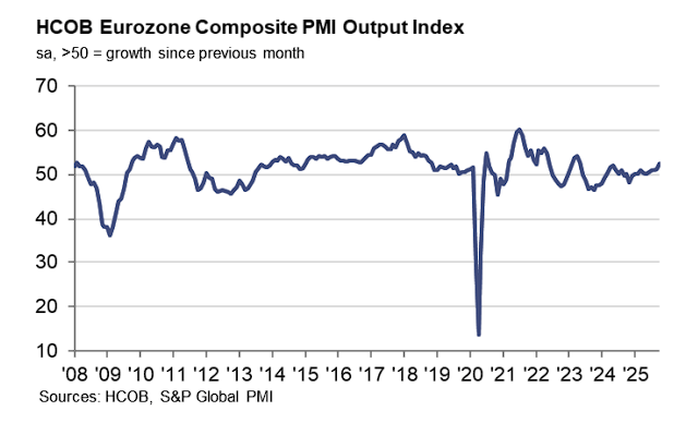 11月5日,S&P Global汇编的最终数据显示,欧元区10月综合PMI终值升至52.5,主要得益于德国以29个月高点的综合PMI成为区域增长引擎,尽管法国综合PMI进一步深陷收缩区间。