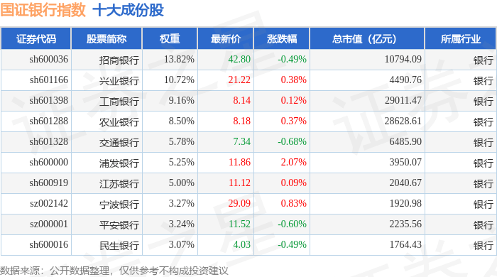 证券之星消息,11月5日,国证银行(399431)指数报收于8188.81点,涨0.03%,成交312.74亿元,换手率0.28%。当日该指数成份股中,上涨的有11家,浦发银行以2.07%的涨幅领涨,下跌的有19家,苏州银行以0.83%的跌幅领跌。