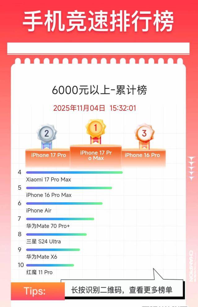 据京东双11手机竞速榜数据显示:苹果摘得销量冠军,小米则紧随其后位居第二,成为国产手机冠军。同时代表高端机的6k+手机市场,苹果、小米包揽机型销量前五,其中小米17 Pro Max则位居第四。