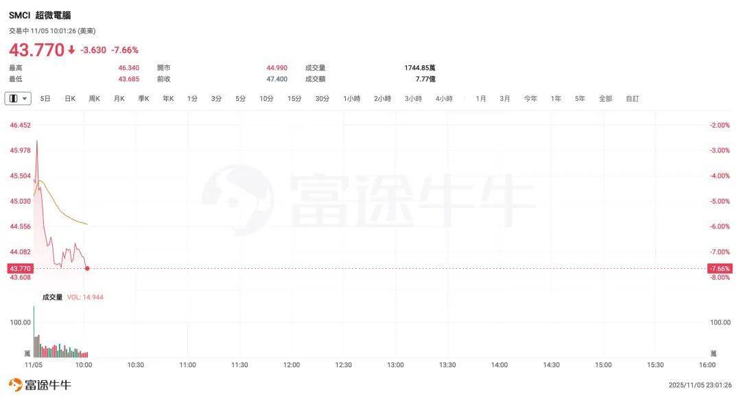 人工智能概念股超微电脑 (SMCI.US)股价大跌7.66%,此前该公司公布了令人失望的第一财季业绩。