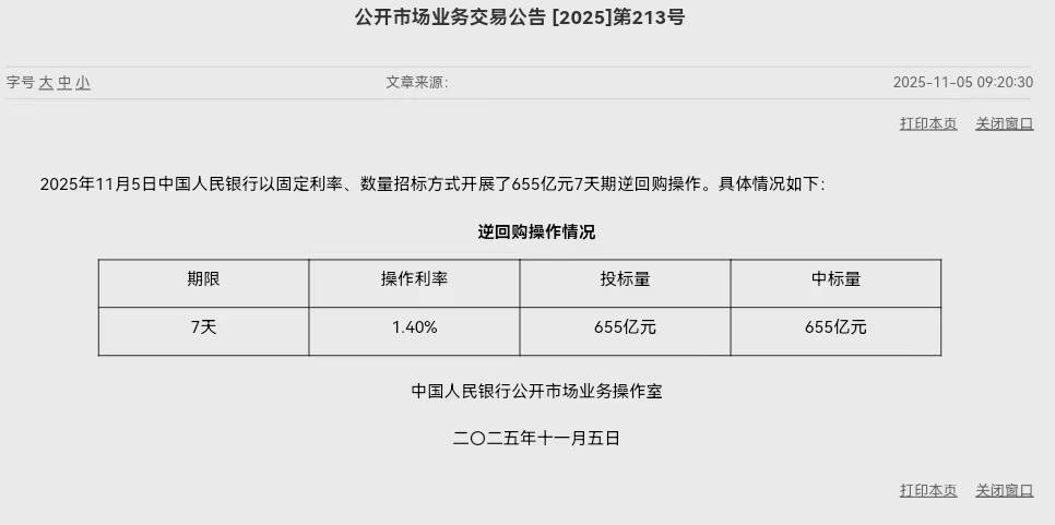 央行网站11月5日消息,央行今日开展655亿元7天逆回购操作,操作利率为1.40%,与此前持平。因今日有5577亿元7天期逆回购到期,当日实现净回笼4922亿元。