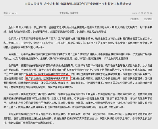 2024年12月,中国人民银行 农业农村部 金融监管总局联合召开金融服务乡村振兴工作推进会议。会议强调,探索差异化融资服务模式,增加信用贷款供给,推广农业设施、活体畜禽等抵质押贷款。
