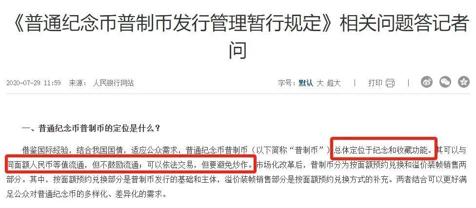在2020年,央行曾经在《普通纪念币普制币发行管理暂行规定》相关问题答记者问中提到,纪念币总体定位于纪念和收藏功能。