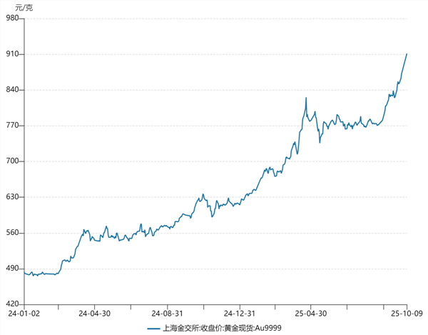 国内方面,10月9日,上海黄金交易所Au99.99当日收于911.5元/克,续创新高。与此同时,当日国内多家金店黄金零售价格超过1160元/克。