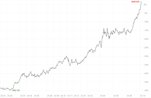截至10月8日,伦敦现货黄金收盘价突破每盎司4000美元关口,创下历史新高,其2025年至今涨幅高达+53.97%,是去年全年涨幅(+27.22%)的近2倍。【1】