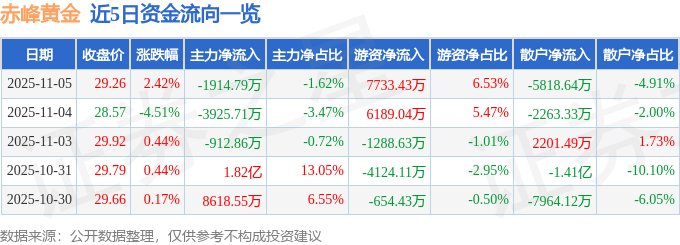 证券之星消息,截至2025年11月5日收盘,赤峰黄金(600988)报收于29.26元,上涨2.42%,换手率2.47%,成交量41.1万手,成交额11.85亿元。