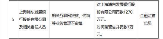 国家金融监督管理总局发布的处罚通告显示,因在相关互联网贷款、代销等业务管理环节存在不审慎问题,浦发银行被重罚1270万元,相关责任人被处以警告并罚款7万元。