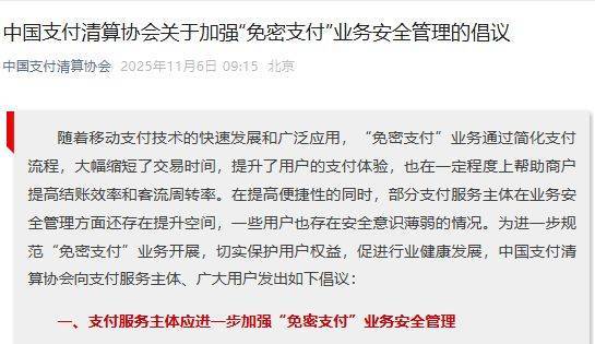 中国支付清算协会表示,“免密支付”业务健康发展需行业与用户共同努力。请各支付服务主体积极响应倡议,落实安全管理要求,广大用户增强安全意识,共同筑牢支付安全防线。