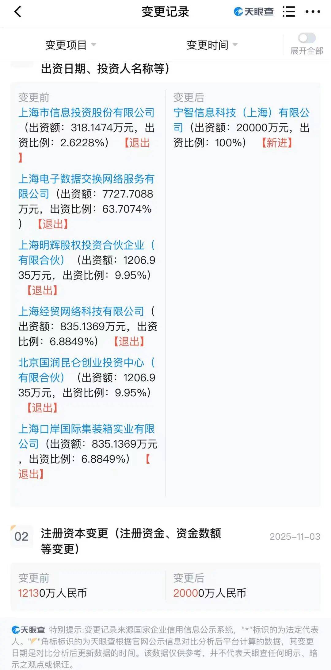 天眼查相关历史股东信息显示,此前,东方支付有6家股东,但均在2025年11月4日退出。第一家上海电子数据交换网络服务有限公司2010年首次持股,其退出时持股比例为63.7074%,认缴出资额为约7727亿元。第二、三家上海明辉股权投资合伙企业(有限合伙)、北京国润昆仑创业投资中心(有限合伙),均为2013年首次持股,其退出时持股比例均为9.95%,认缴出资额均为1206.935万元。第四、五家上海经贸网络科技有限公司、上海口岸国际集装箱实业有限公司,均为2010年首次持股,其退出时持股比例均为6.8849%,认缴出资额均为835.1369万元。第六家上海市信息投资股份有限公司,2010年首次持股,其退出时持股比例为2.6228%,认缴出资额为318.1474万元。