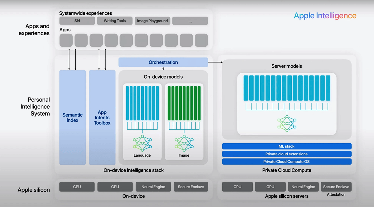今年 7 月,苹果机器学习研究团队发布了一份,披露了苹果的两类自研模型。首先就是那套约 30 亿参数的端侧模型,针对 KV-cache 共享、量化感知训练等进行了优化;其次就是去年底就透露出的百亿级参数云端大模型,采用了目前主流的 Mixture of Experts(MoE)架构,计划将多专家路径与苹果的 PCC 私有云计算服务器深度结合,以提升推理效率与隐私安全。