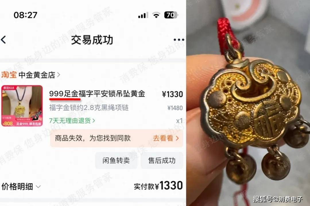 11月5日,黄女士在消费保平台发布了关于淘宝商家售卖假黄金的投诉。图片上,所谓的“黄金吊坠”已明显掉色,暗沉发黑,显然不是黄金。而订单页面,商家赫然标注着“999足金”的字样。