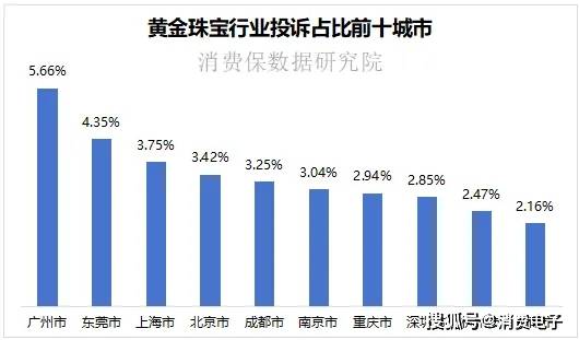 根据地域数据显示,黄金珠宝行业中,广州市的用户投诉量位居第一,占总投诉量的5.66%;东莞市(4.35%)位居第二,上海市(3.75%)位居第三。