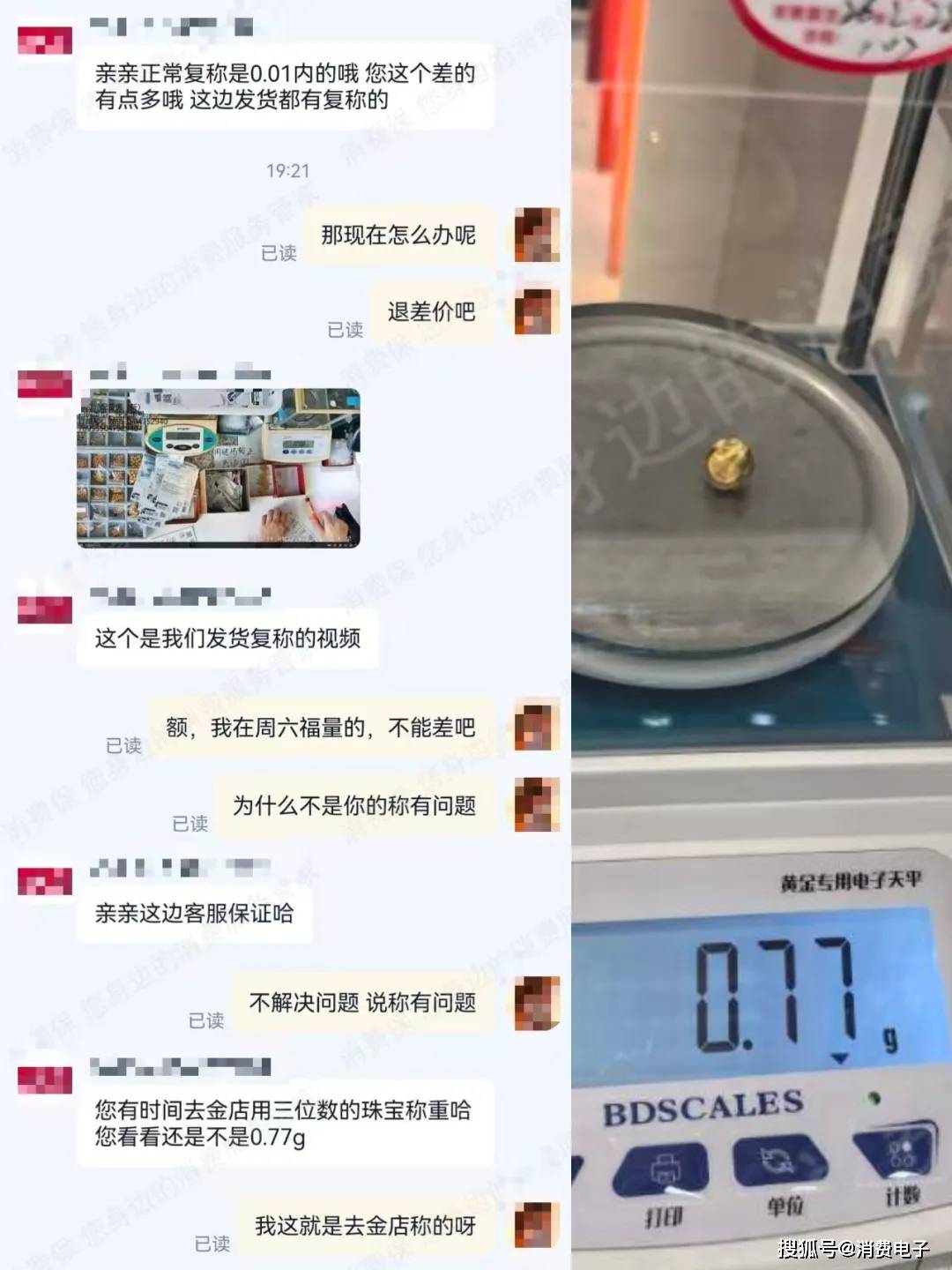 11月4日,消费者刘女士在消费保平台投诉称,其在淘宝购买的足金饰品克重虚标。商家标注的金饰克重为0.9克,而刘女士自行称重后发现仅有0.79克。随后她前往周六福专柜再次进行专业称重,结果显示为0.77克。