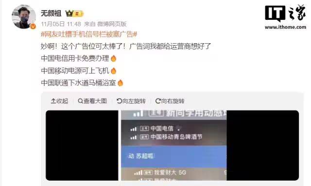 11 月 6 日消息,有网友近日在社交媒体发帖称,手机信号栏处的卡号运营商名称发生变化,多出了类似广告的文字。不少网友表示也遇到过该情况,还一度以为是手机出了问题。