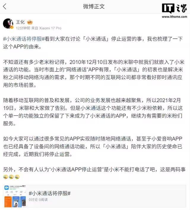 王化回应小米通话将停服:历史使命已经完成,并非手机不能打电话