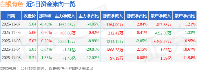 证券之星消息,截至2025年11月7日收盘,白银有色(601212)报收于5.04元,下跌0.4%,换手率1.1%,成交量81.44万手,成交额4.11亿元。