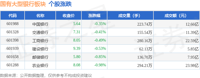 证券之星消息,11月7日国有大型银行板块较上一交易日下跌0.68%,农业银行领跌。当日上证指数报收于3997.56,下跌0.25%。深证成指报收于13404.06,下跌0.36%。国有大型银行板块个股涨跌见下表: