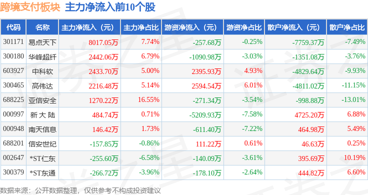 从资金流向上来看,当日跨境支付板块主力资金净流出18.47亿元,游资资金净流入3.59亿元,散户资金净流入14.88亿元。跨境支付板块个股资金流向见下表: