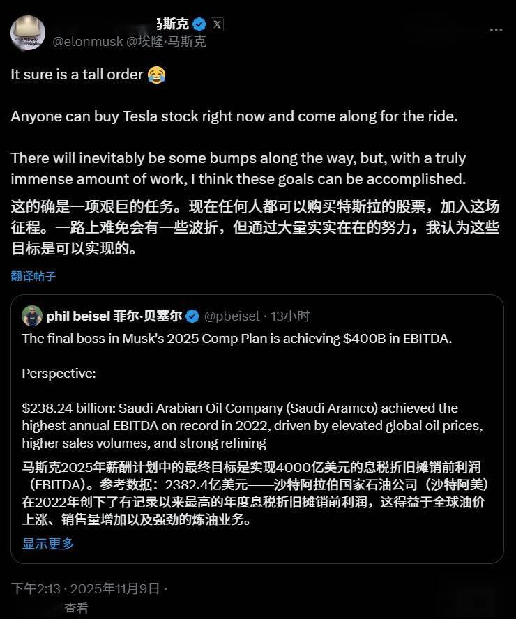 马斯克今日转发了一条贴文,其中提到:“马斯克 2025 年薪酬计划的‘终极目标’是实现 4000 亿美元(IT之家注:现汇率约合 2.85 万亿元人民币)息税折旧摊销前利润(EBITDA)。2382.4 亿美元 —— 这是沙特阿拉伯国家石油公司(沙特阿美)2022 年创下的史上最高年度 EBITDA。彼时受全球油价高企、销量增长、地缘政治紧张及疫情后需求复苏推动,该公司炼油利润率表现强劲。这一数字远超埃克森美孚(2022 年为 1025.9 亿美元)、英伟达(2024 财年为 344.8 亿美元)等其他巨头企业。”