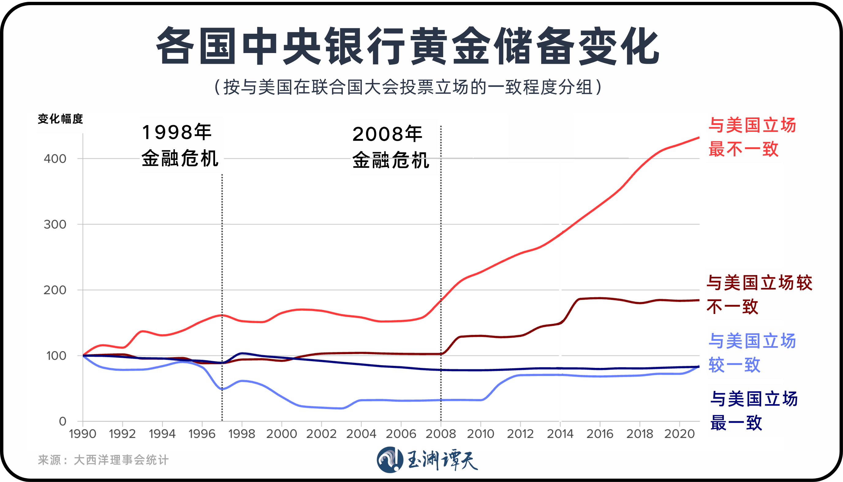 大西洋理事会就给出了一个判断,与美国政治距离越远的国家,购金意愿往往越强。