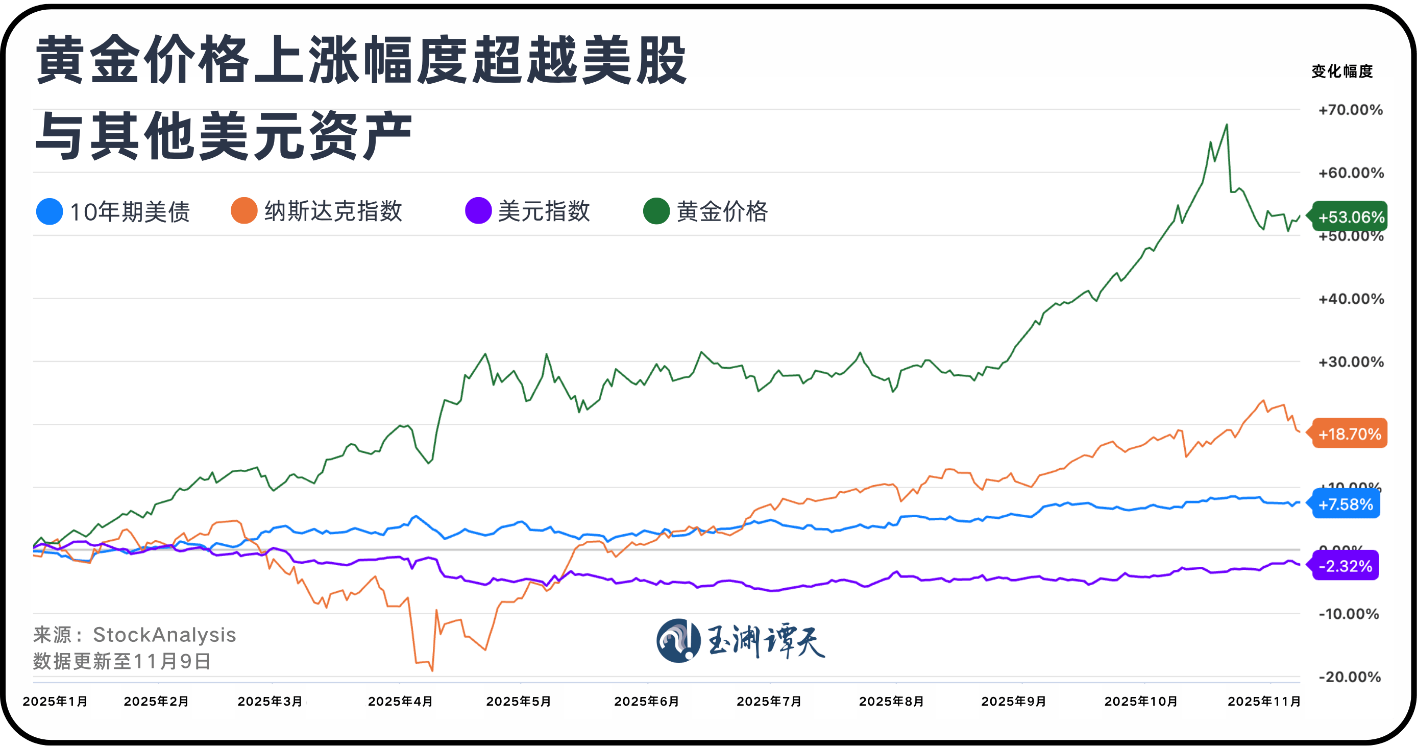 如果再与其他资产对比会发现,今年以来,黄金成了主要资产中涨幅最大的资产类别,甚至超过美股。